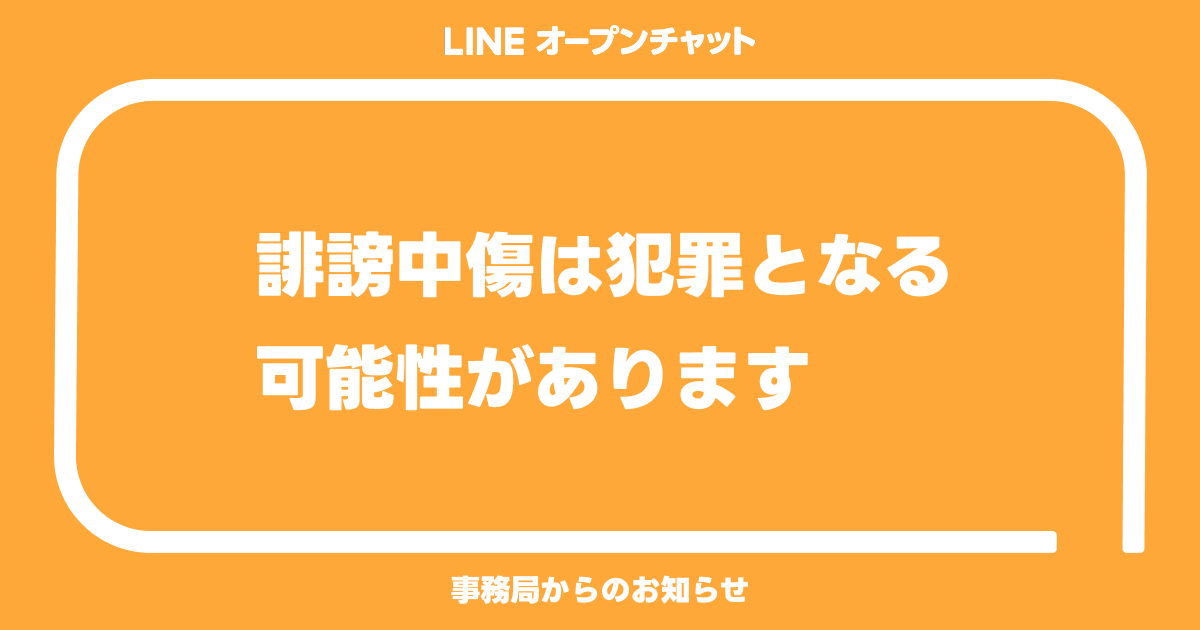 またこのような行為は、オープンチャット禁止規定における禁止項目「2. 誹謗中傷・過度な批判的表現」等に該当し、該当の投稿コンテンツの削除のみならず、オープンチャット利用停止措置がとられる場合がありますのでご注意ください。
